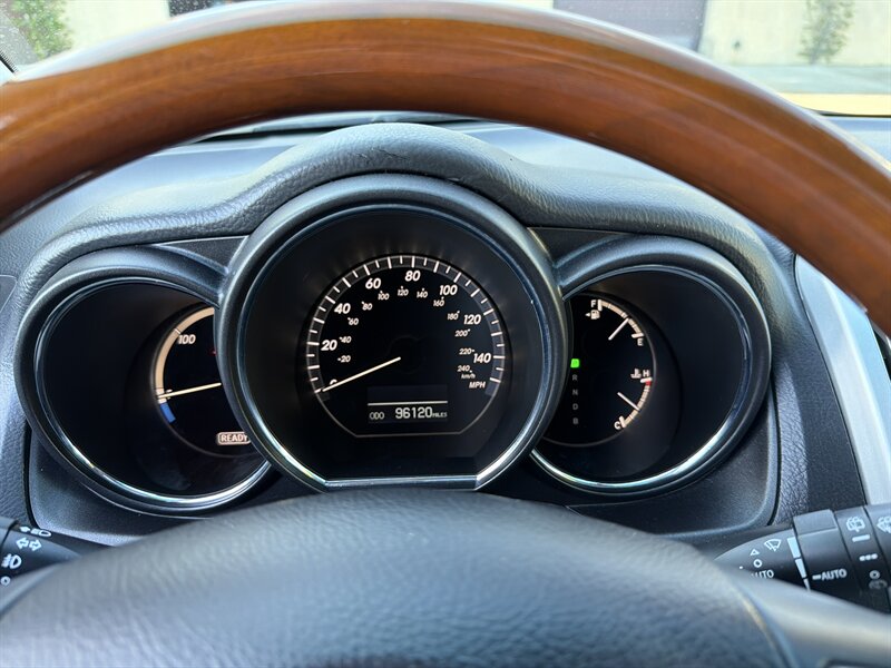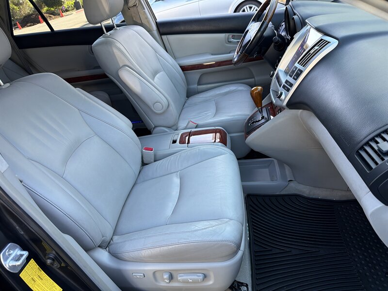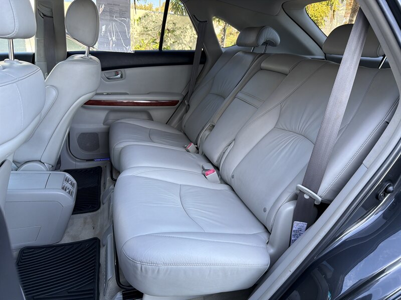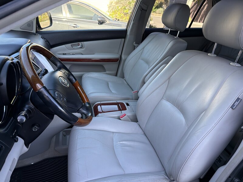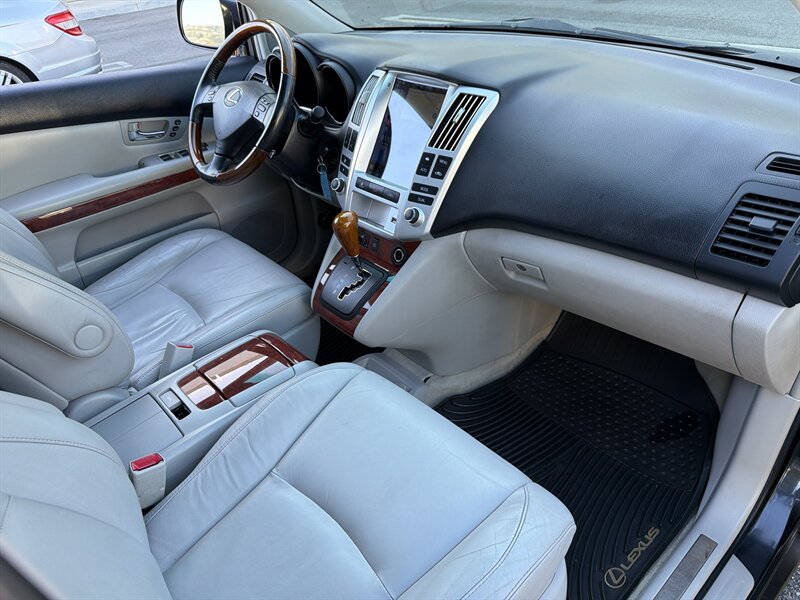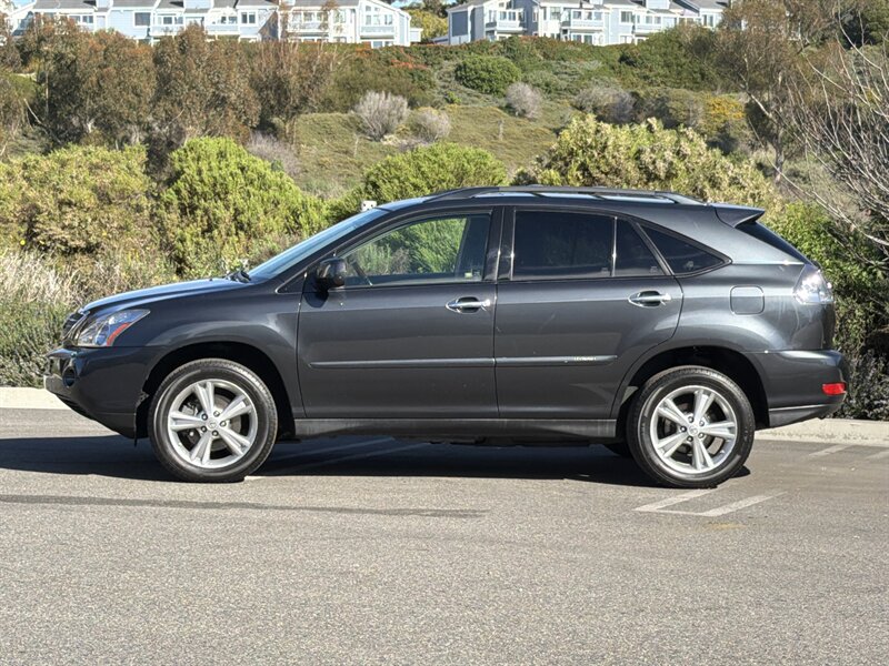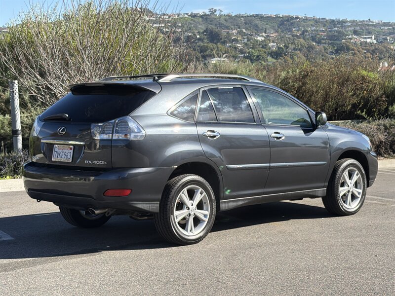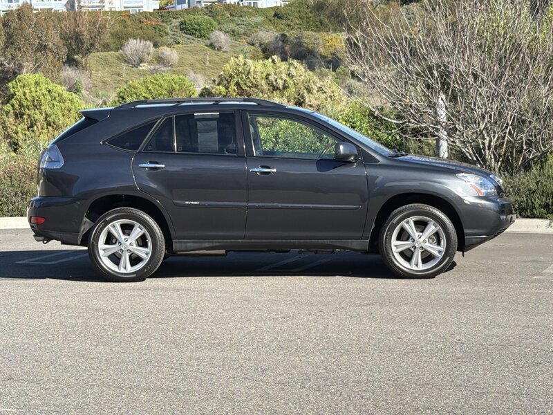 2008 Lexus RX 400h — Smoky Granite Mica exterior, Silver interior, powered by the smooth 3.3L hybrid V6 (268 hp) for Lexus-level quiet and thriftiness. Factory-standard equipment includes the hybrid AWD powertrain with ECVT, leather-trimmed seating with heated front seats and power-adjustable driver seating, dual-zone automatic climate control, power windows/locks/mirrors and remote keyless entry, tilt/telescoping wheel with steering-wheel audio controls, premium audio (CD/aux), and a full safety suite: ABS, traction and stability control, front-side and curtain airbags and tire-pressure monitoring. Clean CARFAX, excellent overall condition, under 97,000 miles (averaging less than 6,000 miles/year) and EPA-rated roughly 26 MPG city / 24 MPG highway — sensible, luxurious, and slightly smug about its fuel economy.