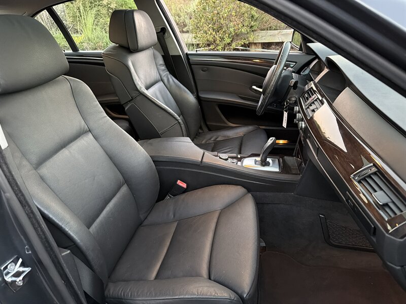 2009 BMW 528i — Gray exterior, Black Dakota Leather interior, and the famously smooth 3.0L inline-6 delivering 230 hp and 200 lb-ft. Factory equipment includes a 6-speed automatic, power-adjustable front seats in Dakota leather, dual-zone automatic climate control, power windows/locks/mirrors, cruise control, multi-function steering wheel, ABS with traction and stability control, alloy wheels, fog lamps, remote keyless entry and a CD/aux audio system with steering-wheel controls. Below 115,000 miles (under ~7,000 miles/year) and in good overall condition *accident & airbag deployed reported, professionally repaired * Clean Title * luxurious, reliable, and just the right amount of German smugness.